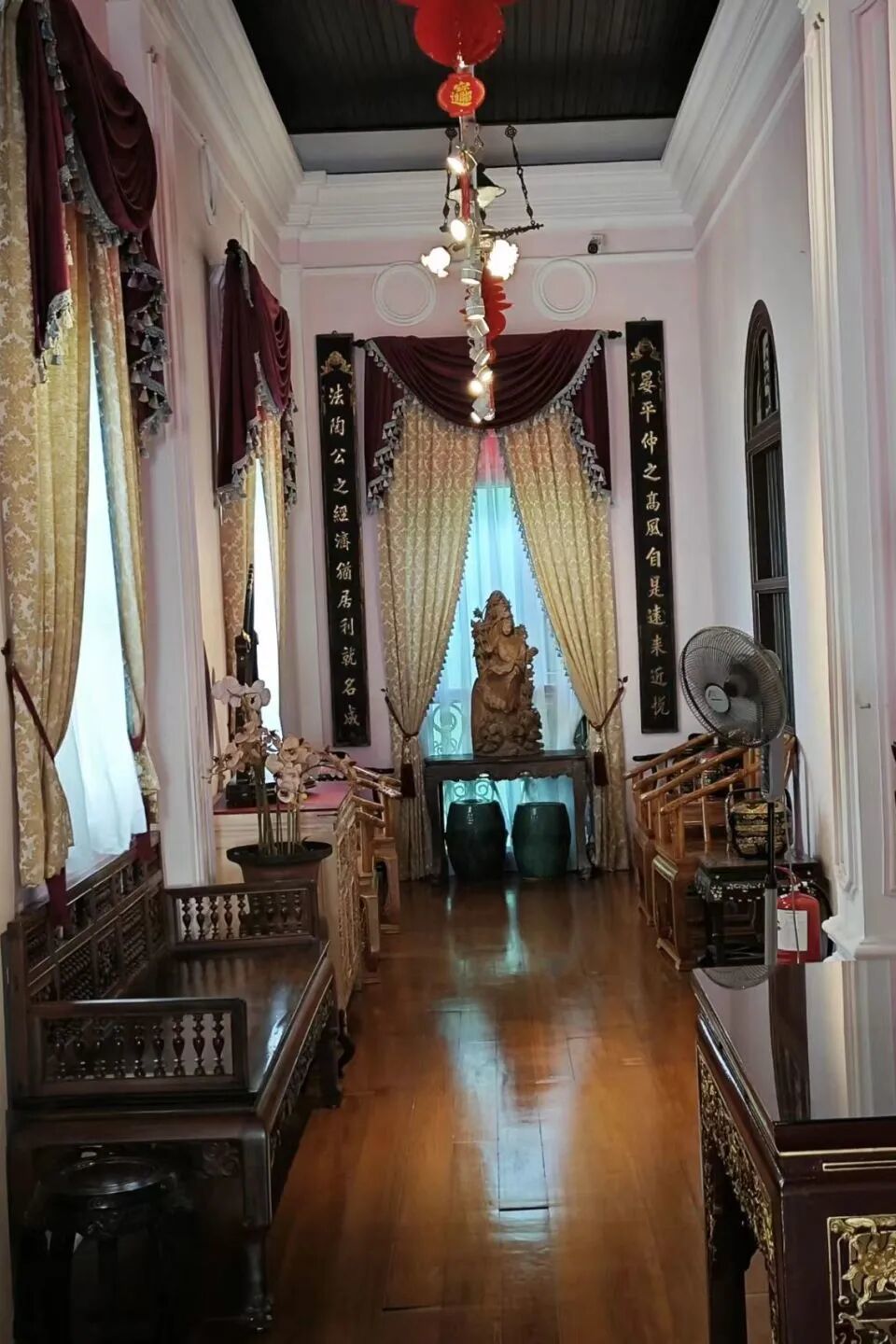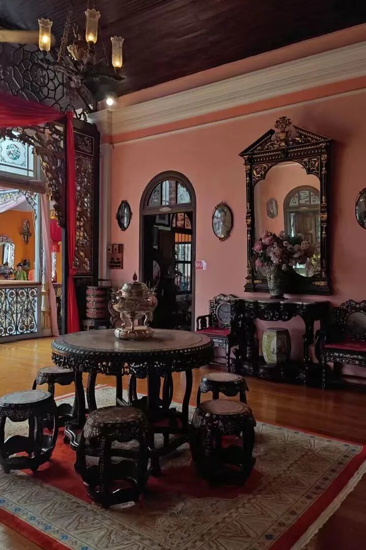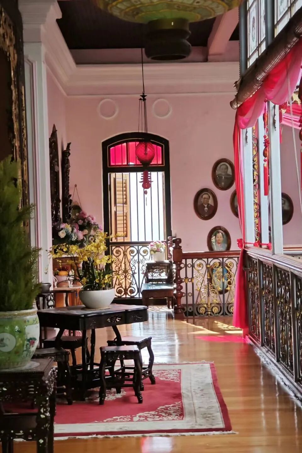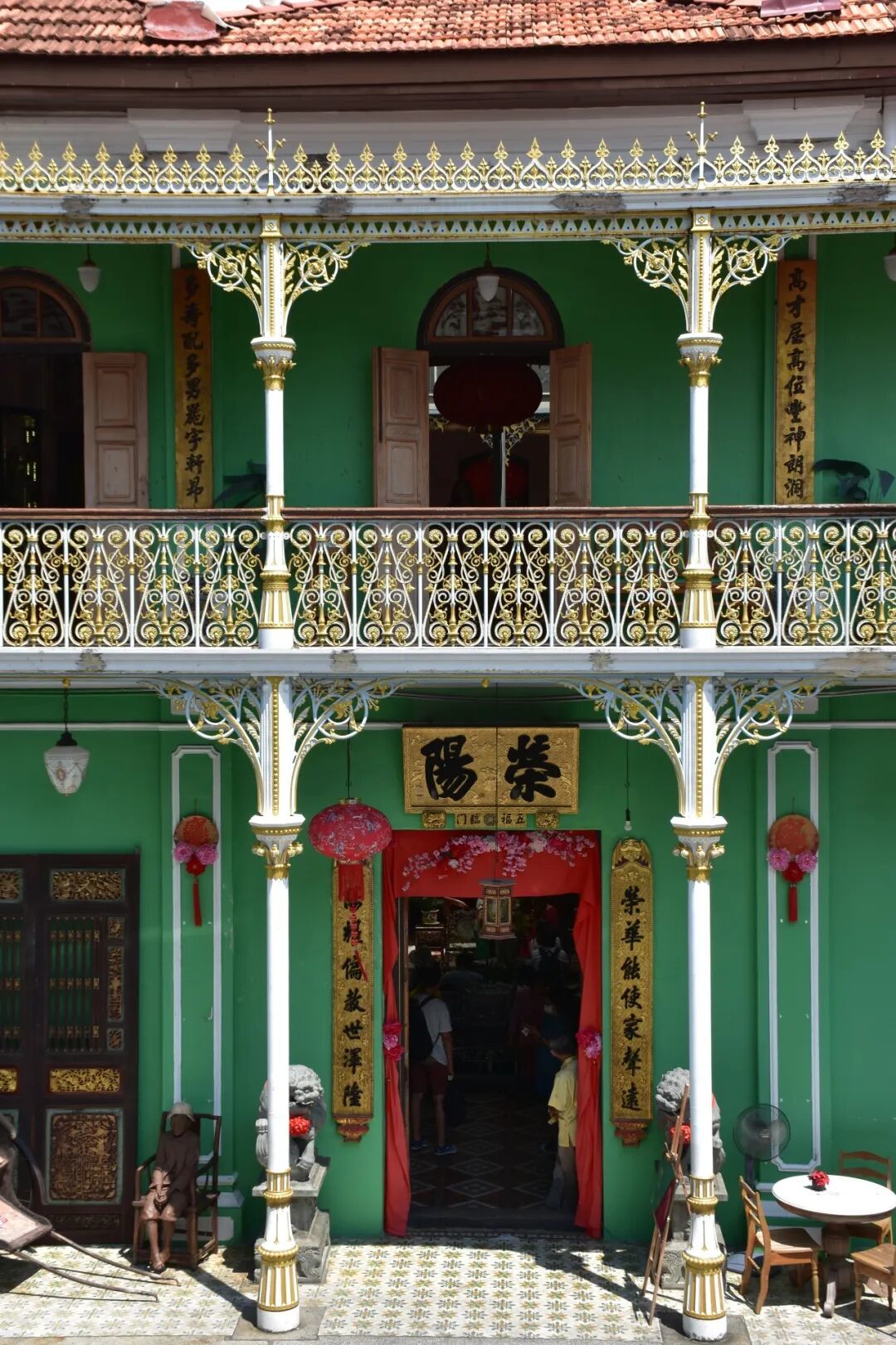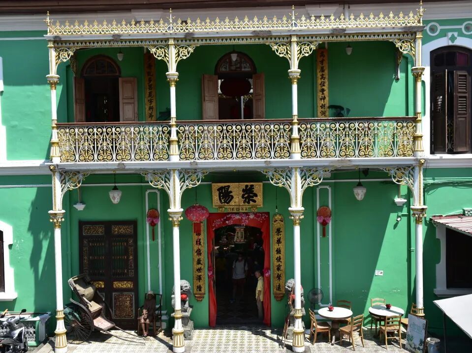 此座宅邸最引人注目的就是它鲜艳的薄荷绿色外墙,因此也被称为“绿屋”。在建筑方面,以其精致华丽的住宅而闻名,房屋融合了中国和马来的建筑风格,以其复杂的木雕、色彩斑斓的瓦片屋顶和美丽的花园为特色。