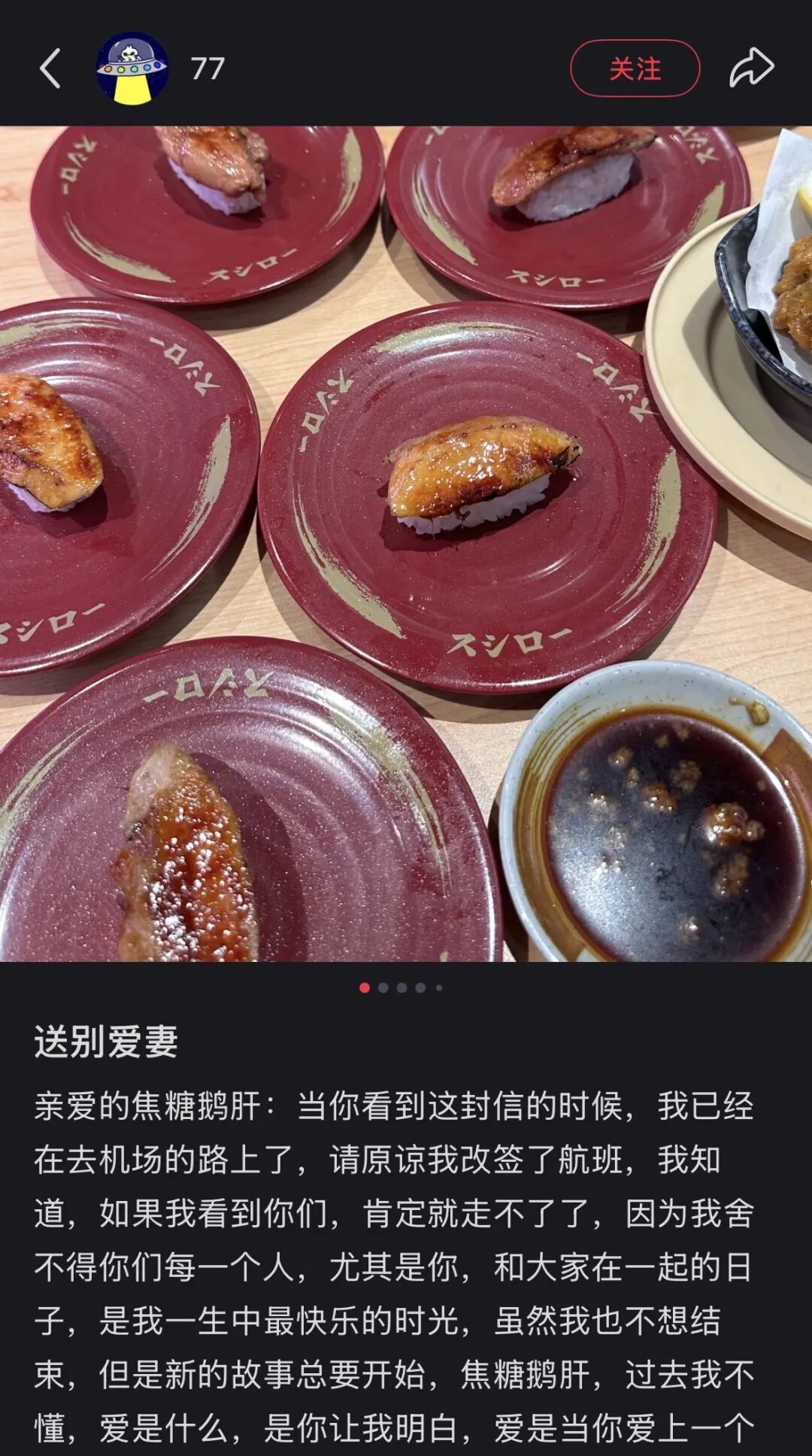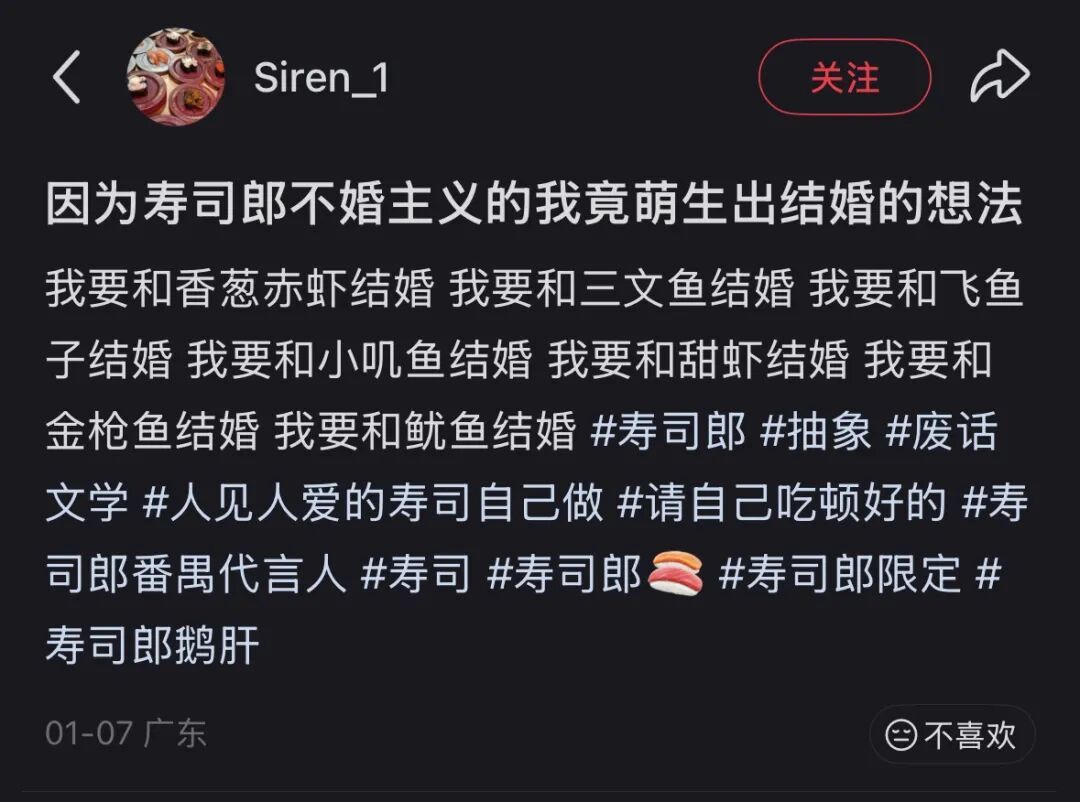 还有模糊了物种边界的不婚主义,对着一盘寿司产生了汹涌的爱意。“因为寿司郎,不婚主义的我竟萌生出结婚的想法”“我要和香葱赤虾结婚,我要和鱿鱼结婚”。