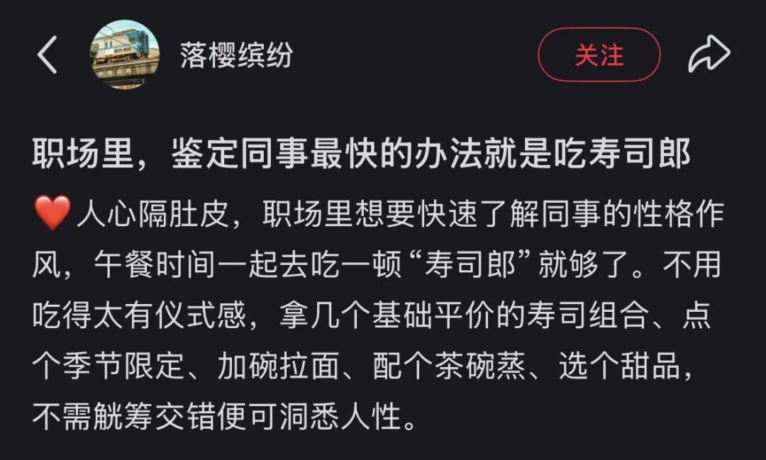 这门学派里,有洞若观火的人性大师,在等位区悟出了职场厚黑学。“想快速看清一个人,带 TA 去吃一次寿司郎就够了。看 TA 面对叫号倒退时的情绪稳定性,看 TA 打包米饭时的利索程度”“不需觥筹交错便可洞悉人性”。