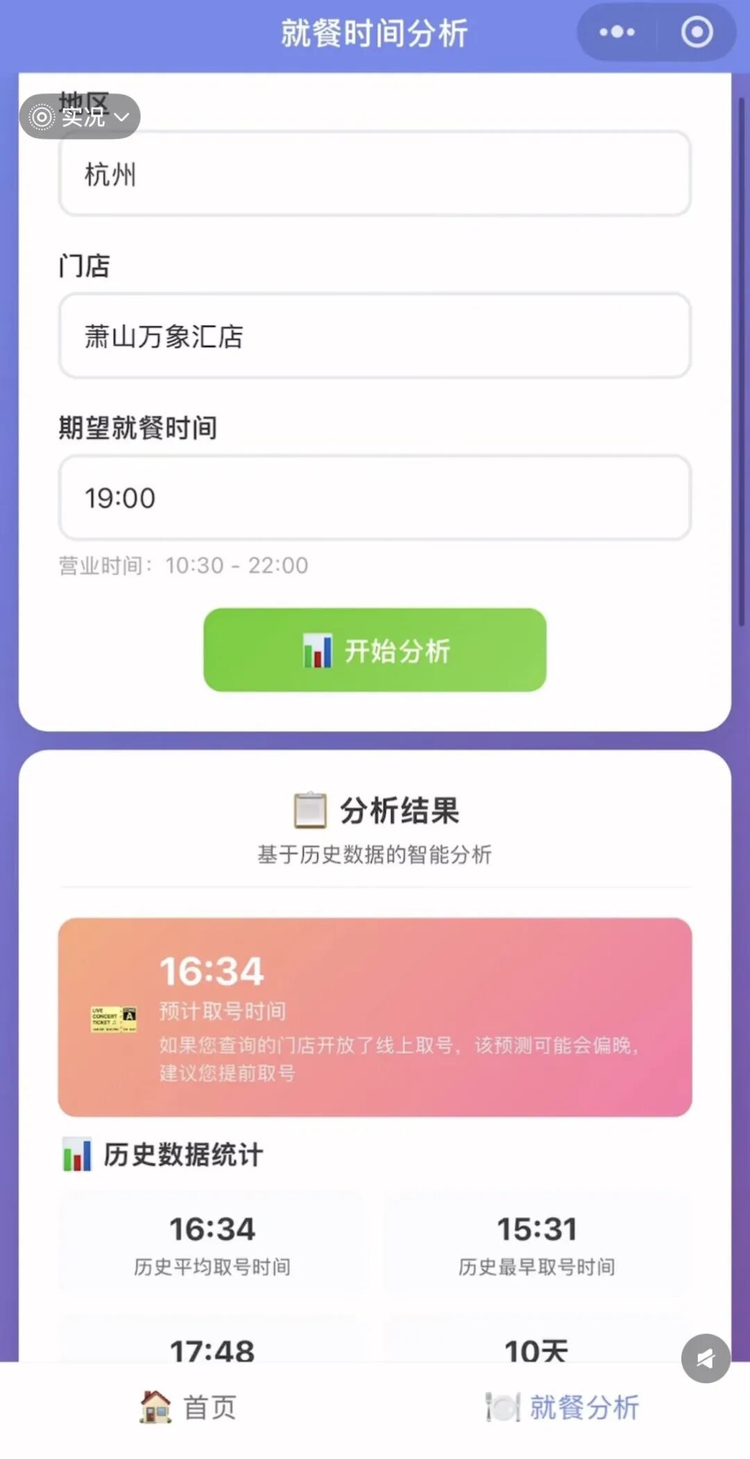 有人甚至为此开发了寿司郎排队预测系统,输入期望的用餐时间和门店,系统会根据历史数据,分析最佳取号时间。