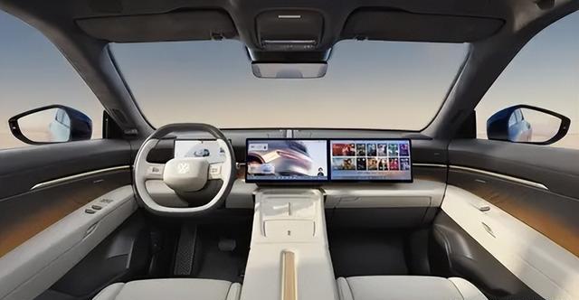 座舱走环抱式设计,10.25 英寸仪表加双 14.96 英寸 2.4K 双联屏,信息显示清晰。方向盘用回实体按键 + 滚轮,中间带金色发光大众标,实用又有质感。