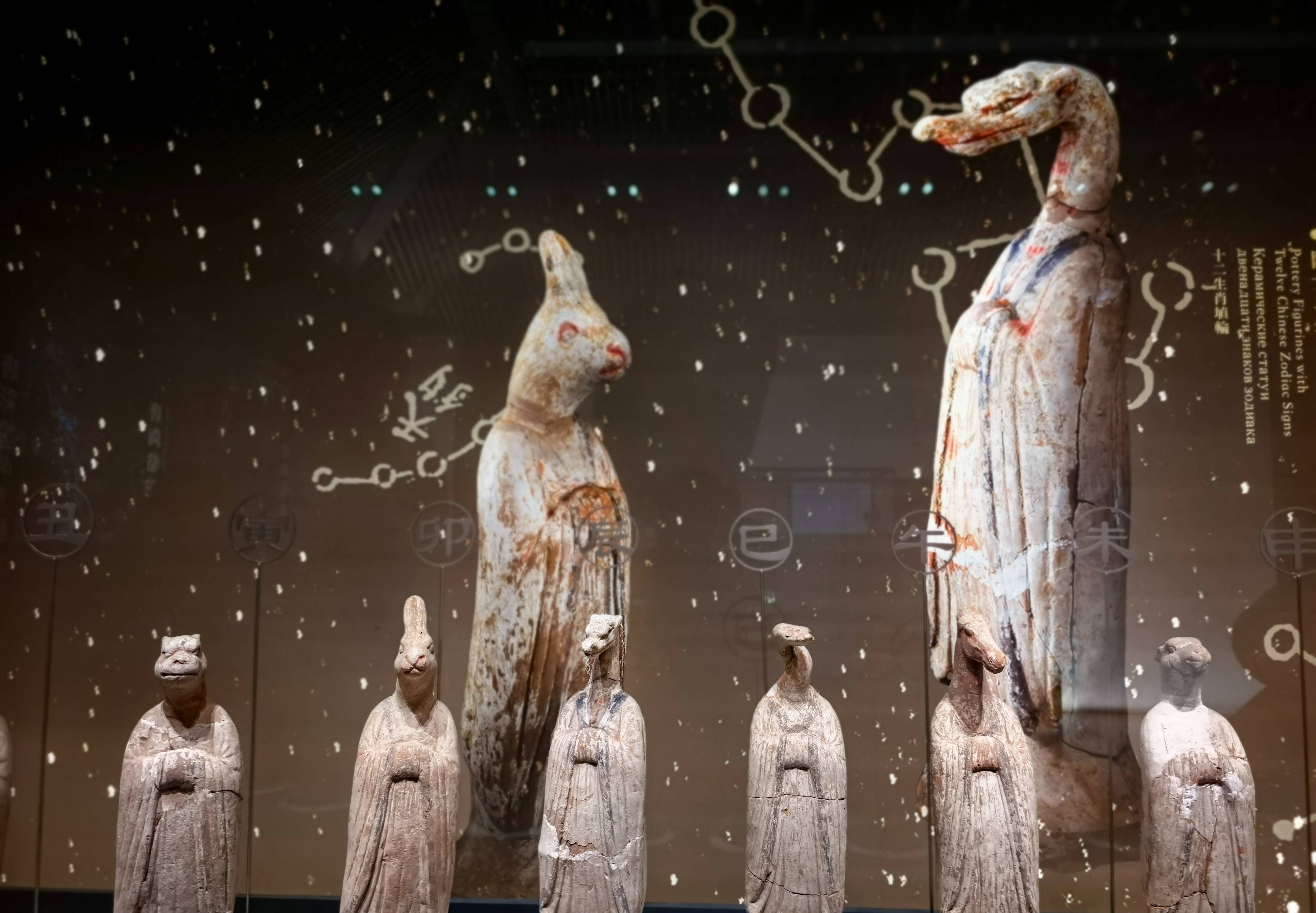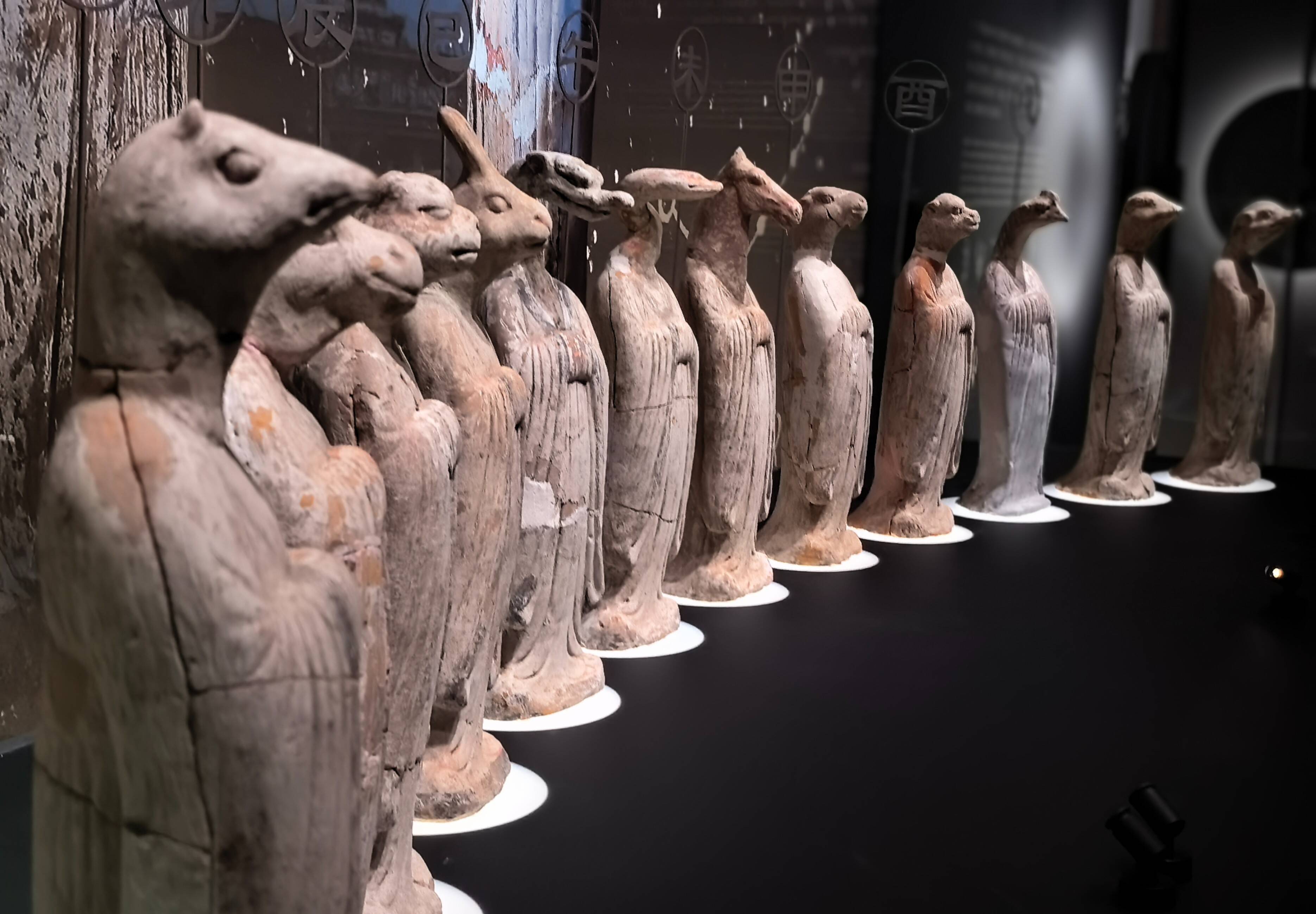 十二生肖高高约数十厘米,人身兽首,身着唐代宽袖长袍,拱手如朝臣按顺时针方向排列,古人将一天划分为十二个时辰,每个时辰由对应生肖守护,象征全天候守护亡灵,体现唐代“事死如事生”的丧葬观念。
