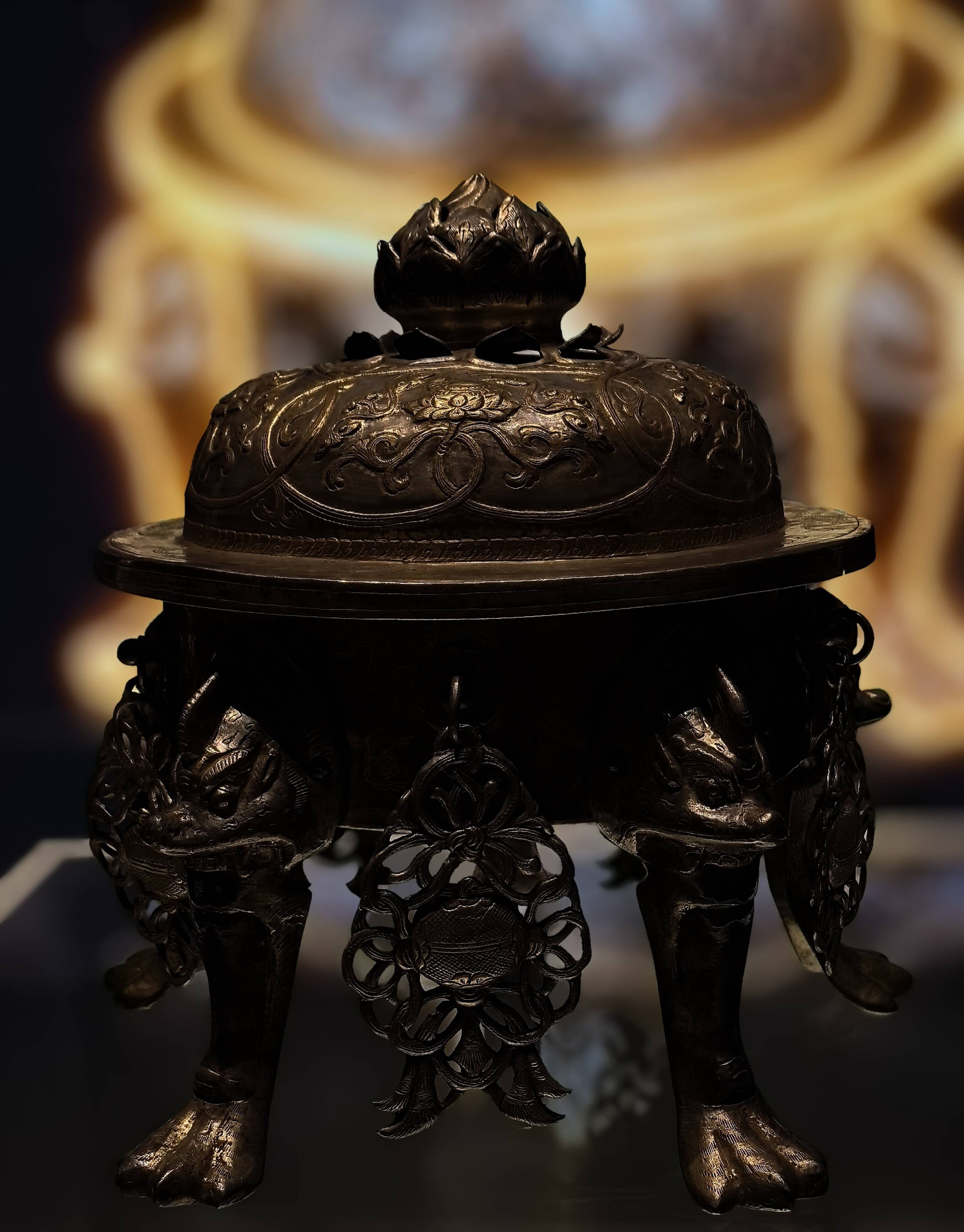 我去的时候,珍宝馆展示的是法门寺出土的鎏金卧龟莲花纹五足朵带银香炉,被誉为“香炉之王”,是唐代金银器同类体量最大,工艺最佳。
